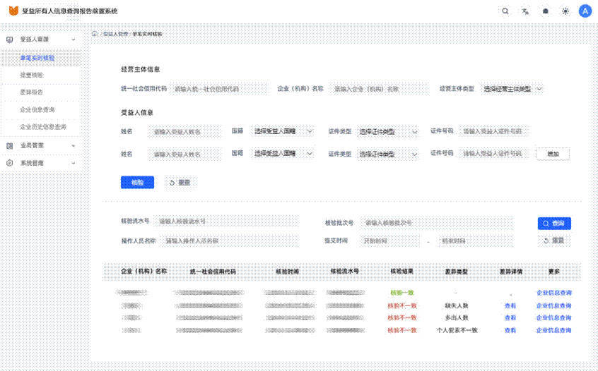 •批量核验:可一次性处理大规模客户核验任务,日均处理能力超百万笔,适配国有大行、股份制银行等机构高峰期业务压力,大幅提升核验效率。例如某城商行接入系统后,客户受益所有人核验时间从3天缩短至2小时,效率提升80%。