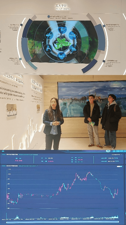 最后,同学们走进上海环交所交易大厅。在环交所的工作人员引导和专业讲解下,透过交易大屏,大家直观地了解到碳市场交易实时动态;清晰地理解了从配额分配、市场交易到清算履约的全流程运作机制。这一环节让课堂知识与眼前真实的碳金融市场基础设施直接联系,完成从知识理解到场景认知的关键跨越。